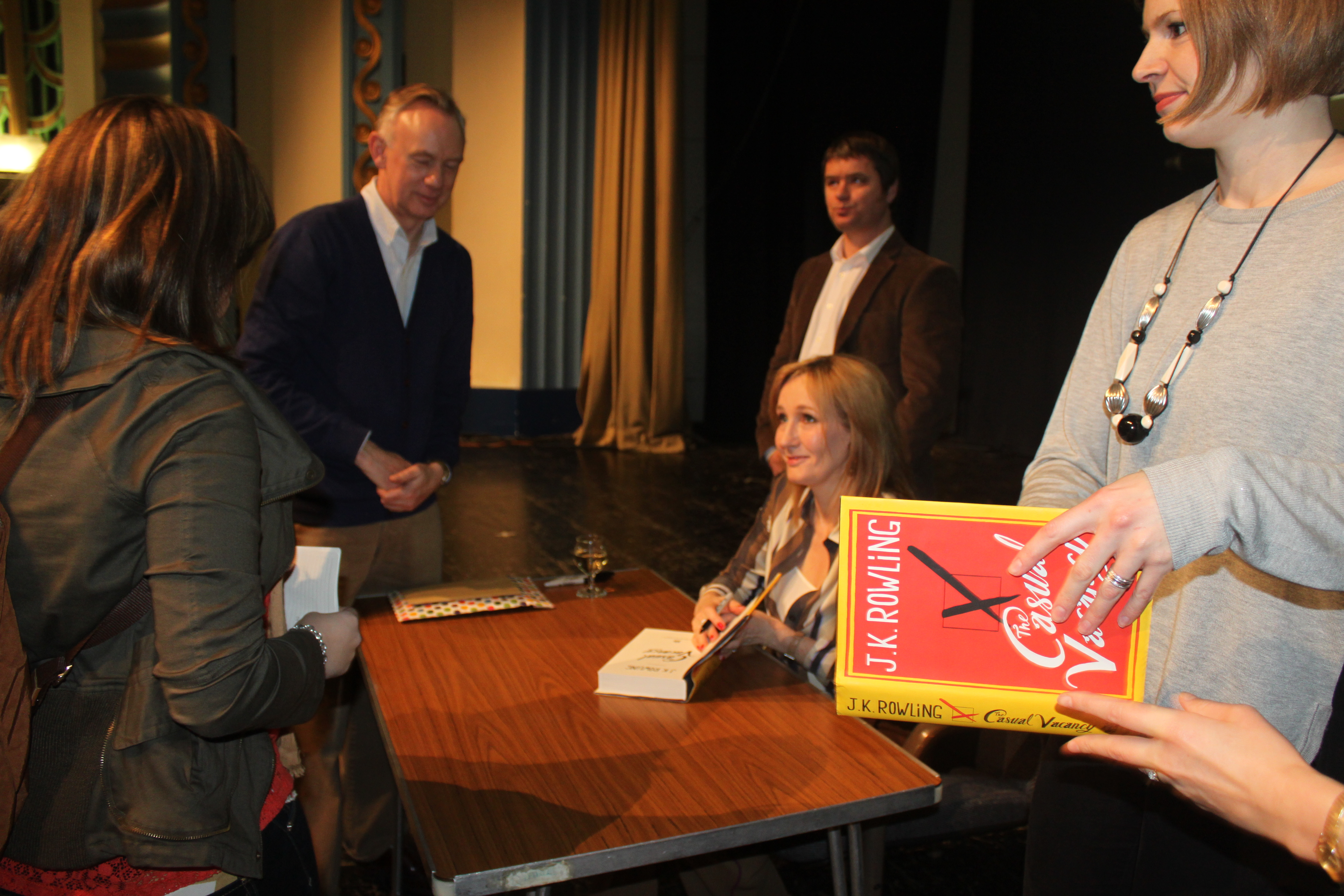 No sooner had I thought it than a woman walked out on stage and called everyone’s attention. I looked at my watch. 8:17pm. Okay not bad. She went over a few details. No phones or cameras during the talk. The usual etc. And then she mentioned the book signing. “Ms. Rowling will speak for an hour and then do a book signing. Any one who wishes to have their book signed will get it signed.” We all breathed a sigh of relief. There had been rumors that not everyone would get a chance. “She will only be signing a copy of The Casual Vacancy. Only one book per person. No dedications.” Womp. Well there went my plans to get a book signed for my sister. I promised myself to make it up to her somehow.