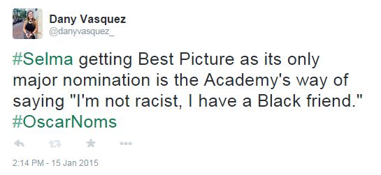 - How the Academy could have so utterly failed to acknowledge Selma past a Best Picture and Best Song nod is beyond me
